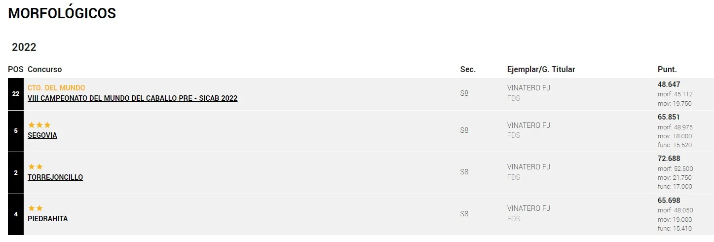 En este último concurso al que presentamos a nuestro mejor ejemplar, Vinatero, tuvo unas estupendas clasificaciones, quedando entre los mejores 25 caballos del mundo en su sección, llegando a ser el número 12 en la categoría de Mejores Movimientos.